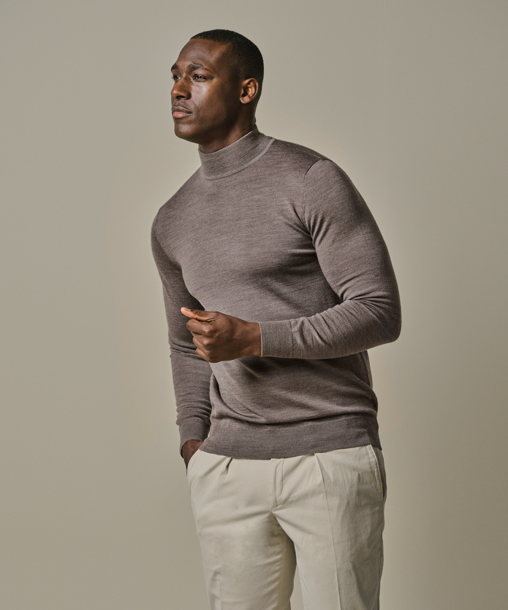 Deze trui heeft een zogenaamde mock neck, hierdoor staat de kraag wat hoger maar niet zo hoog...meer